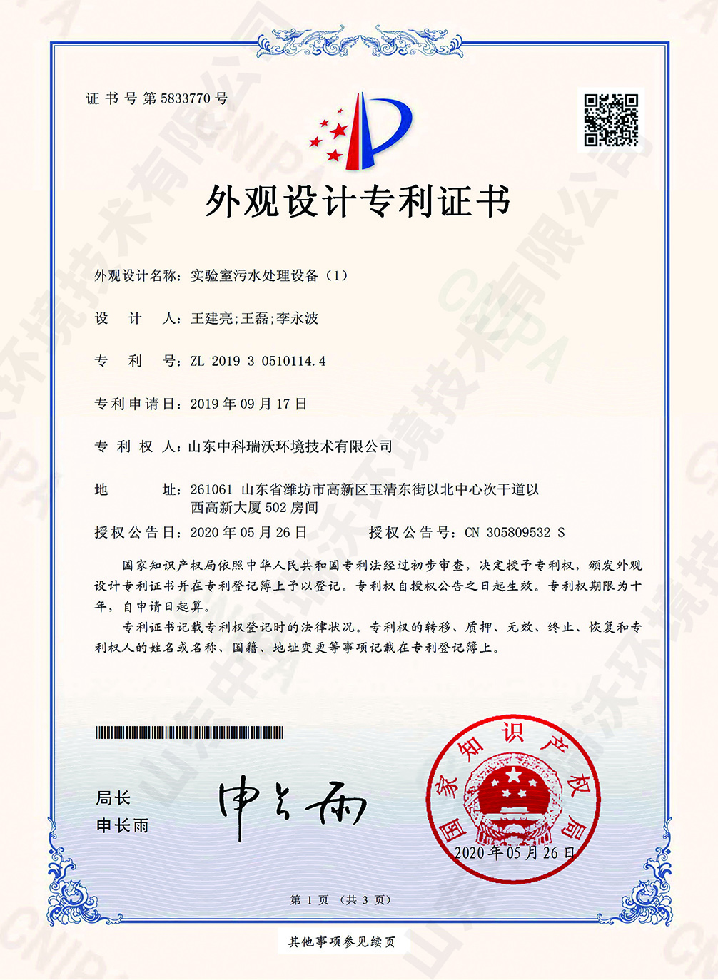 全自動中水回用設(shè)備~專利證書